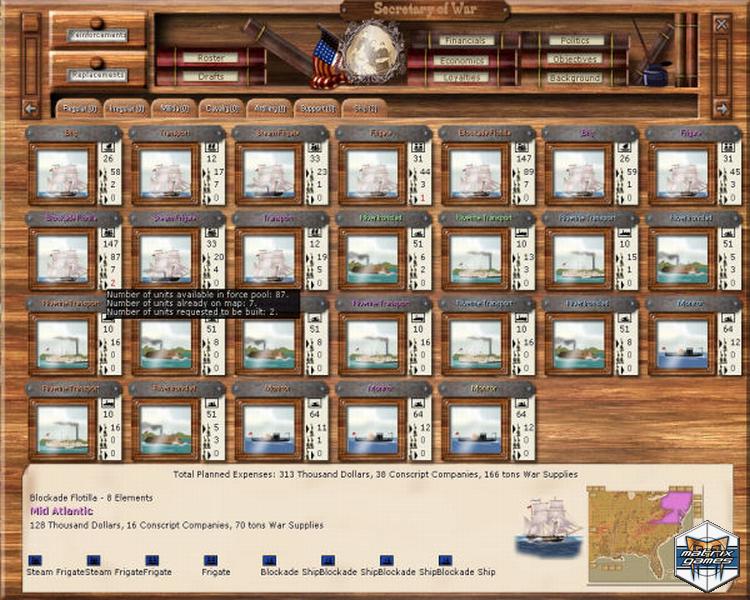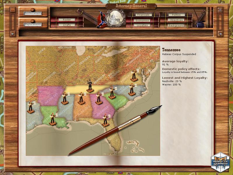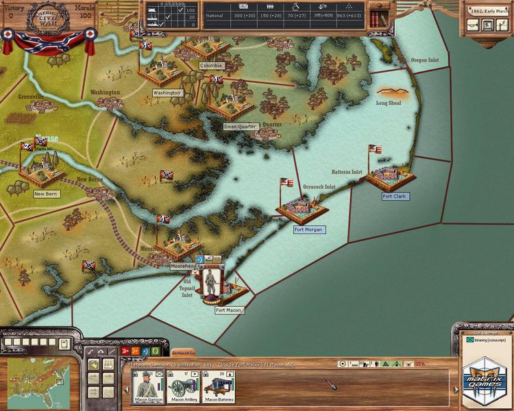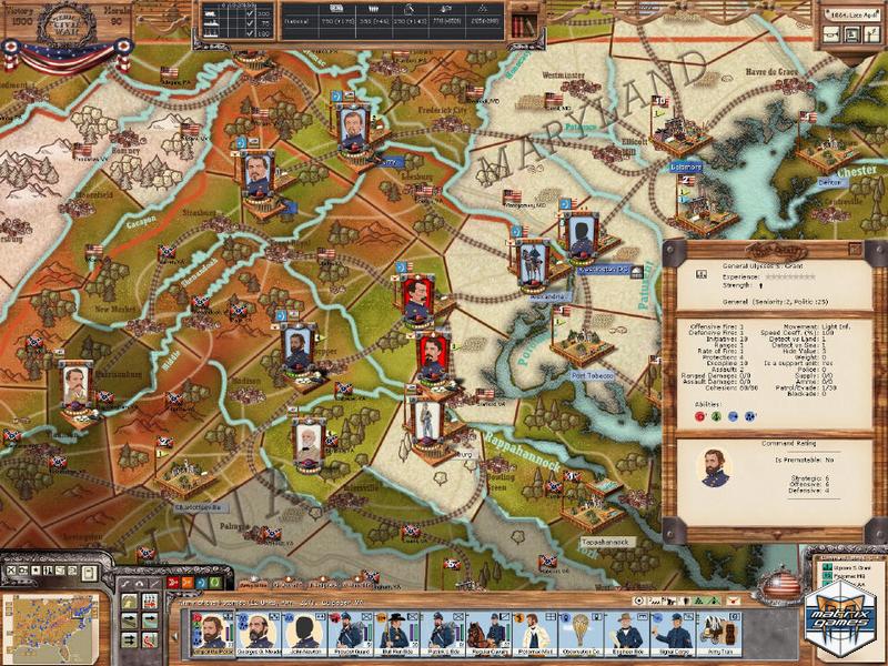 Organize divisions, armies and corps, manage supply and morale, use sea, riverine and rail moves, and put the best leaders in command (if politics allows)! Fight to reconcile the nation (USA) or ensure independence (CSA): victory can be military or political, as national will plays a crucial role.