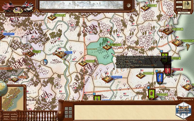 Covering the period from 1755 to 1783, in Birth of America you will have the chance to command forces during the French and Indian War and, of course, the American Revolutionary War. Scope of the game covers all of North America (Florida to Quebec and New England to Mississippi) which are portrayed by over 700 accurately drawn provinces. Every province is meticulously crafted through a great diversity of terrain, climates, and civilization levels to represent the unique strategic situation presented by the geography of each region.