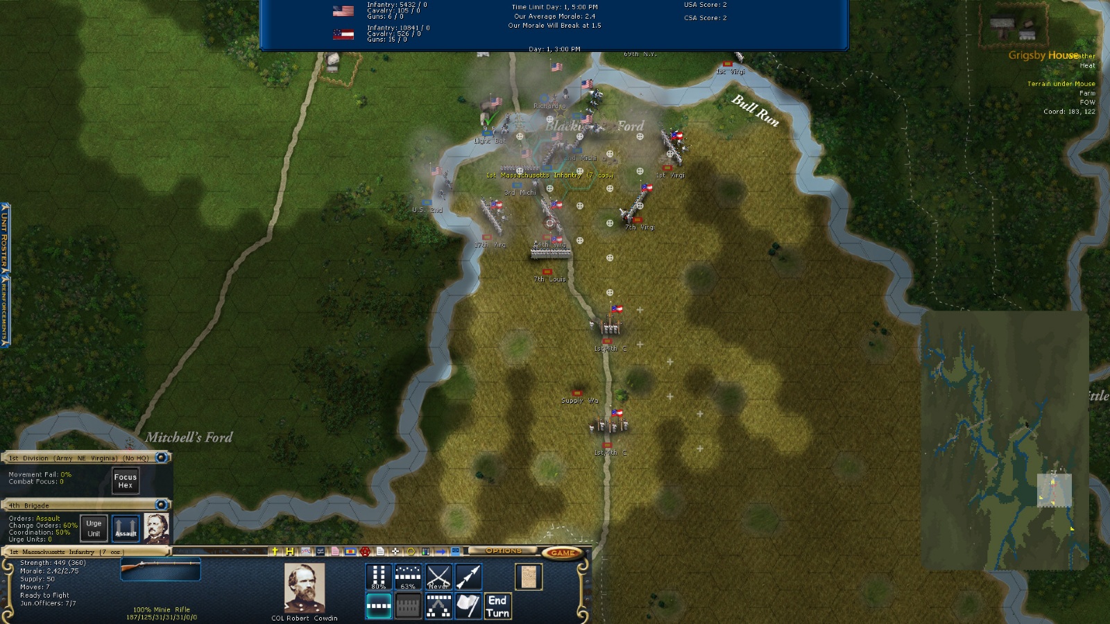 The maps themselves are vast, some as large as 50 square miles, and at 75 yards per hex are rendered in intricate detail. The game engine presents the player with a novel system of movement and issuing orders that emphasize the difficulties of wielding command-and-control over Civil War era regiments.