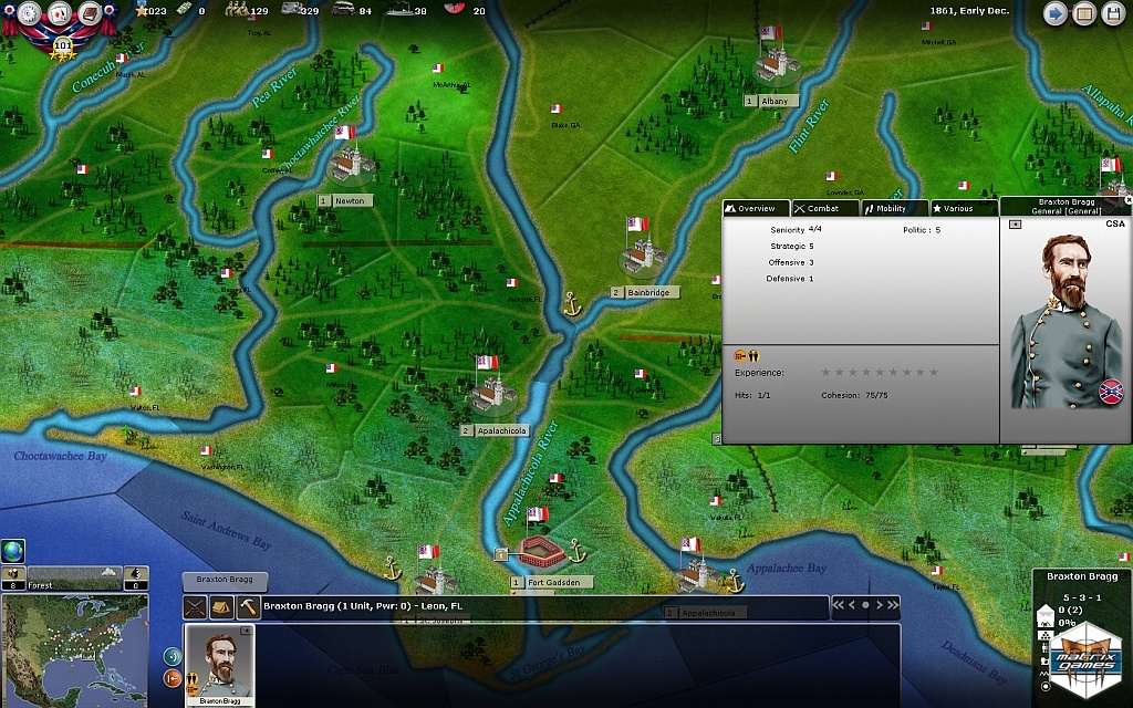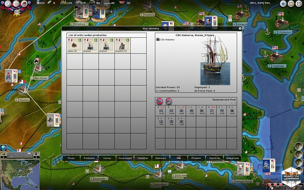 Take part of the military and political leadership, trying to lead your nation to victory, in the midst of some of the toughest operations of the Civil War. You will build, organize and command your armies over one of the largest maps of the USA ever made for a Civil War game. There are a host of real military leaders to appoint with their own strengths and weaknesses and choosing the right man for the job is crucial. However you are not just a military leader and must make vital economics and political decisions. These can have far reaching effects and you can even influence foreign intervention from the French & British who were constantly intervening in America for power and prestige.