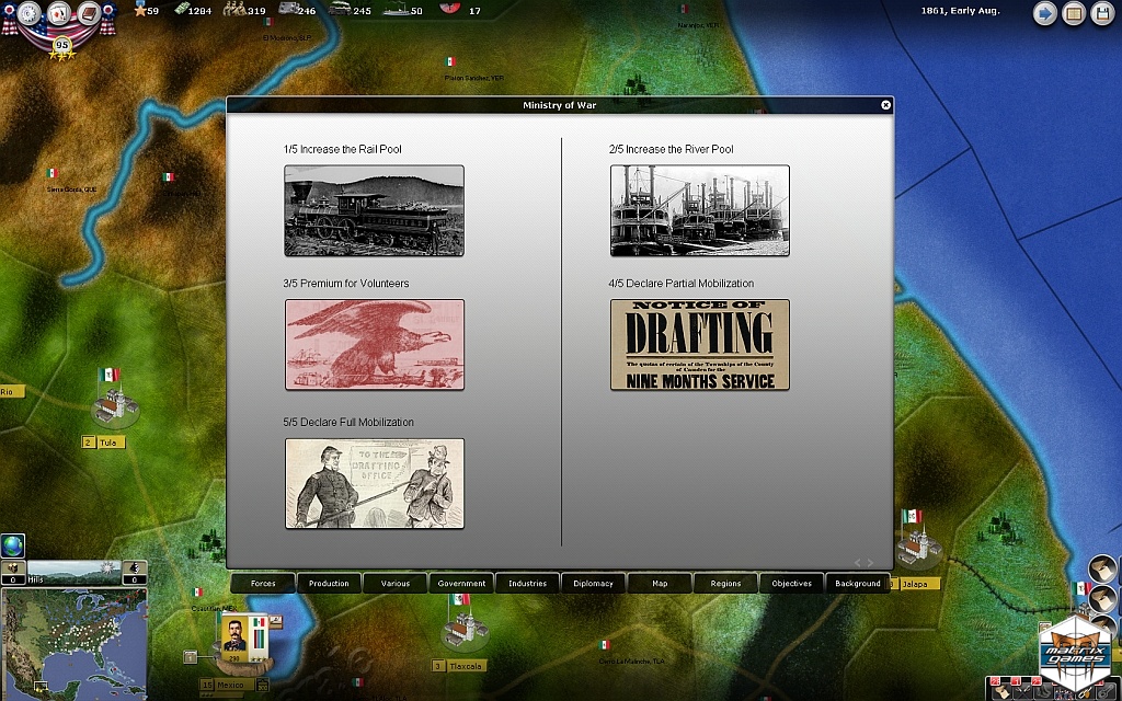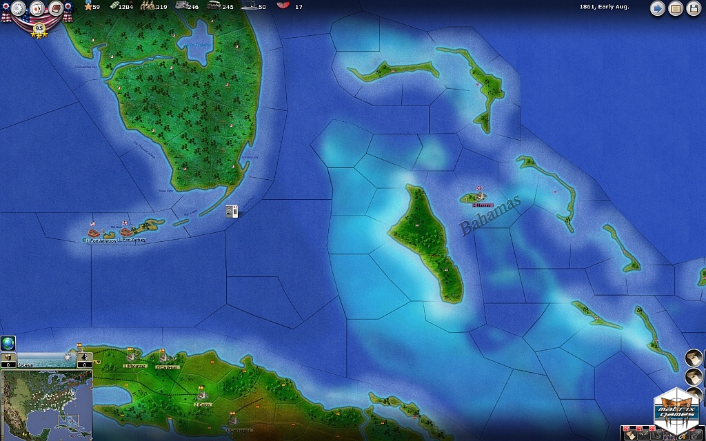 The game covers all of the USA, from the Eastern seaboard to the Rockies, from 1861 to 1865. Mexico and the Northern Caribbean are also in the map. Game map is divided into more than 3,000 regions, with a variety of terrain, climates and development level. Scenarios: 2 tutorial and 5 main scenarios from Shiloh all the way up to the Grand Campaign. Two Tutorials: scenarios 1861 First Manassas (Battle of Bull Run) 1862 Shiloh 1862 Sibley (New Mexico Campaign) 1861-1865 Our Hearts were Touched with Fire April 1861 scenario (THE multi-theater Grand Campaign) 1861-1865 The Blue and the Gray July 1861 scenario (accelerated start campaign).