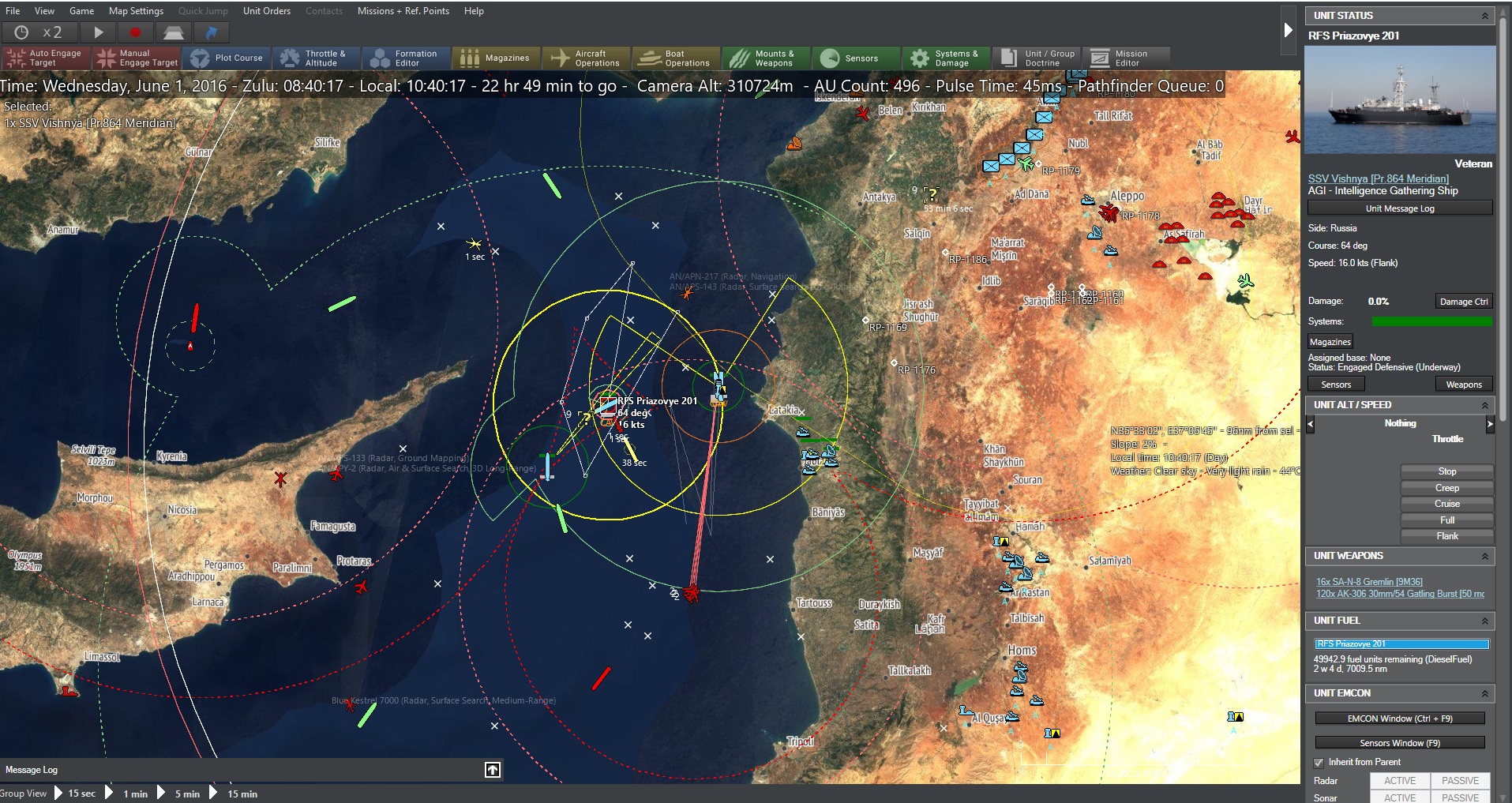 The weather today is hot and somewhat hazy. Your forces represent the best in the Russian military, a mix of over 40 aircraft from the most modern fighters to unmanned surveillance drones, the best SAM system in the world, two of the quietest submarines available and one of the most potent ships afloat patrolling off the coast. Still, you are surrounded, vulnerable and outnumbered.