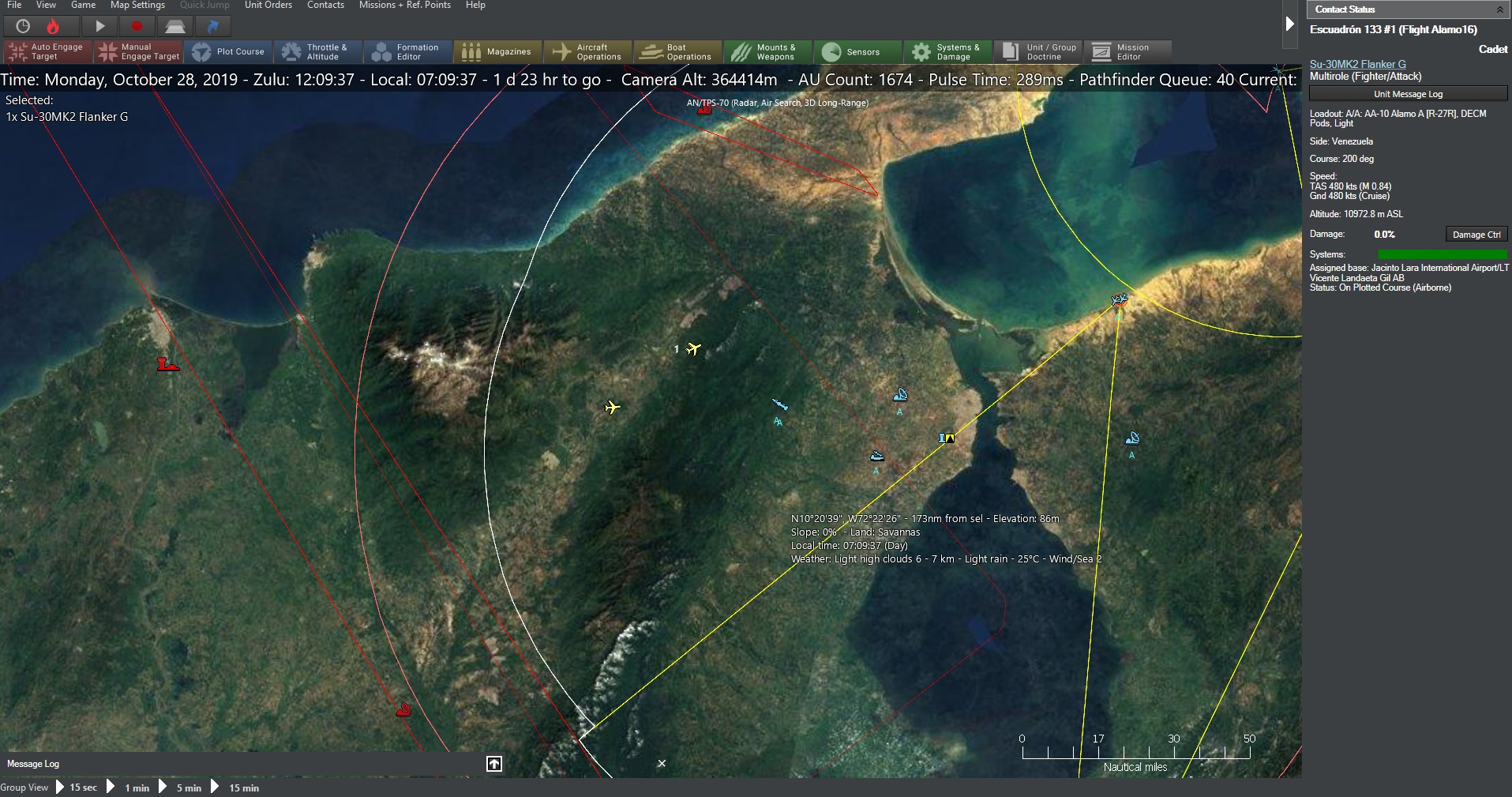 Friendly Forces. NAS Key West: 2x B-1B Detachment of the 9th Bomb Squadron USAF, 8x KC-135R Rebased from MacDill AFB USAF, 3x E-3G from 970th Airborne Control Squadron USAF, 5x P-8 from VP-26 USN. Luis Munoz Marin International Airport (Puerto Rico): 18x F-15E 333rd Fighter Squadron USAF, 3x EC-130H Detachment 41st Electronic Combat Squadron USAF, 4x KC-130J VMGR-252 USMC, 12x F-35A 421st Fighter Squadron USAF, 2x P-8 from VP-26 (detached) USN. Panama Pacifico International Airport (Panama): 8x KC-135R Rebased from MacDill AFB USAF, 10x F-22 95th Fighter Squadron USAF, 3x E-3G 970th Airborne Control Squadron USAF. Captain German Olano Moreno Airbase (Colombia): 24x F-16 77th Fighter Squadron USAF, 1x Platoon MLRS near Cucuta, 1x Platoon MLRS near Arauca, Luis Munoz Marin International Airport (Puerto Rico), 18x F-15E 333rd Fighter Squadron USAF, 3x EC-130H Detachment 41st Electronic Combat Squadron USAF, 4x KC-130J VMGR-252 USMC, 12x F-35A 421st Fighter Squadron USAF, 2x P-8 from VP-26 (detached) USN. Carrier Strike Group 10 (USN): USS Dwight D. Eisenhower CVN-69, USS San Jacinto CG-56, USS Oscar Austin DDG-79, USS Stout DDG-55, USS Nitze DDG-94, Carrier Air Wing Three. Littoral Combat Group 1 (USN): USS Somerset LPD-25, USS Wayne E. Meyer DDG-108, USS Detroit LCS-7, USS Wichita LCS-13. Submarines (USN): USS New Hampshire SSN-778, USS Toledo SSN-769, USS Pittsburgh SSN-720. Colombia Allied Air ForceEscuadrón de Combate 111-116: Kfir C.10, Escuadrón de Combate 211: A-29B Super Tucano, Escuadrón de Combate 119: A-37B DragonFly. Command & EMCON. Command: USS Dwight D. Eisenhower, EMCON: Alpha-Limited Emissions.