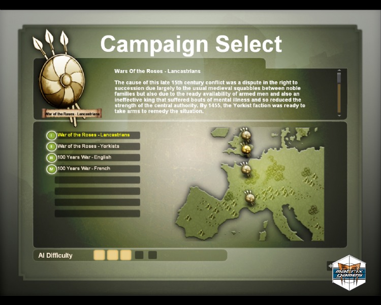 Play as the English or the French in the Hundred Years War, or fight the Wars of the Roses.