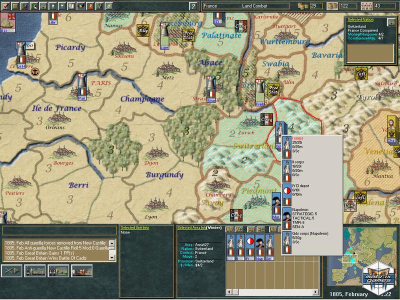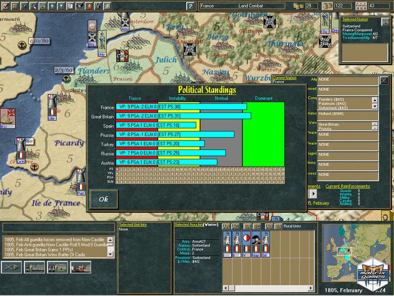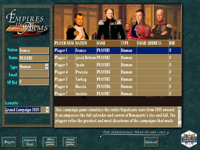 The game moves in monthly turns where diplomacy and builds are conducted. Within the monthly turns there are a variable number of impulses where corps and fleets move about. All movement is simultaneous with battles occurring at the end of the impulse. Battles are resolved by players both picking a strategy and fighting a series of rounds in an attempt to break the enemy. Make and break alliances, declare war, invade minor nations, propose peace terms, build armies of landwehr, regulars, guards, light cavalry, heavy cavalry and artillery. Many historical leaders from the period are included to command corps and fleets, from Admiral Nelson to Marshal Davout to the Pashas of the Ottoman Empires.