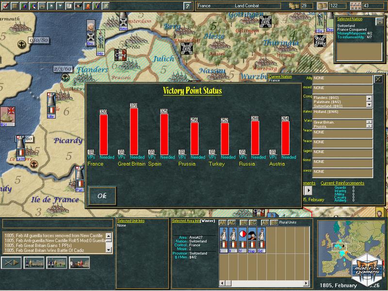 Diplomacy and economics will complement the sharp bayonets and deadly cannons of your direct military might when you take the role of any of the major powers in 19th century Europe! As you conquer your weaker foes, use the money and resources from fallen nations to recruit new units and replenish your ranks. France, Great Britain, Prussia, Turkey, Russia, Spain and Austria all stand ready with their full resources, generals, armies and fleets for you to take command. Join the intricate and deadly contest of power that changed a continent and created a legend.