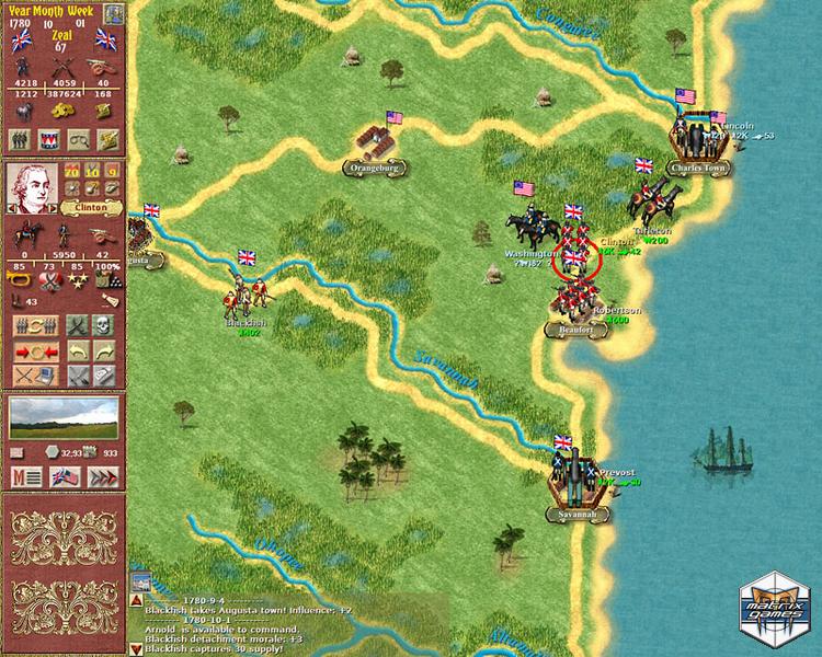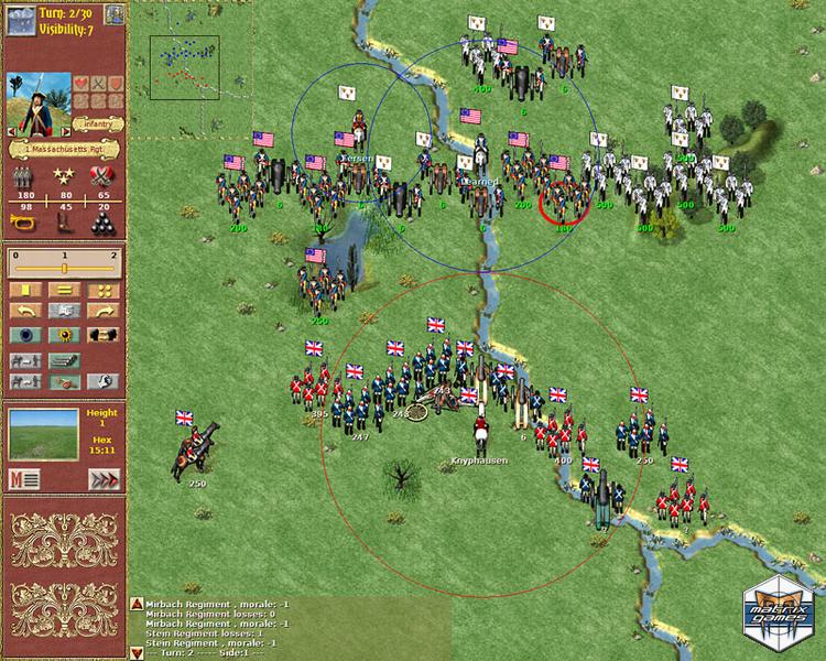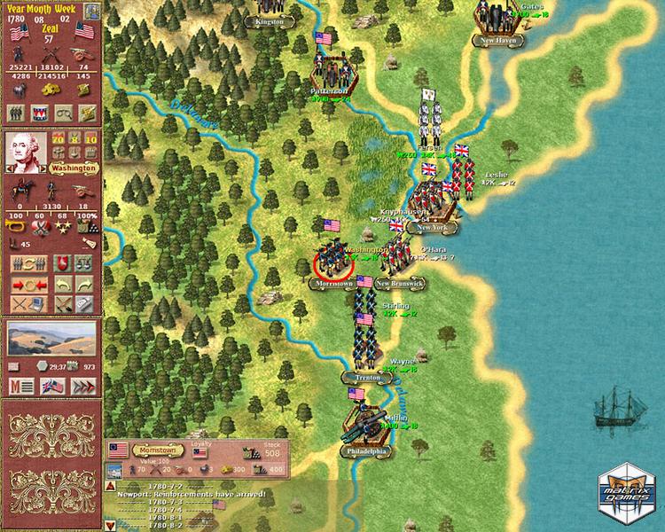 Use your influence to recruit temporary militia, insurgent regiments, or Indian (Native American) warriors that can augment your force. The fleet can be used to transport your troops to hard to reach locations where you can surprise the enemy. You can support your operations with the cannons of your fleets. There are 16 unit types of 5 nations included, each in authentic uniforms. All units in the game are large, animated figures. Each turn covers one week of real time.