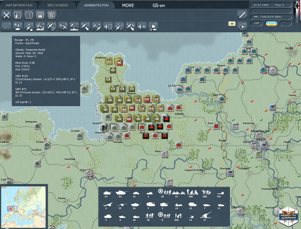 The map has a huge size (36k hexes versus 25k for War in the East) and contains all the terrain types from War in the East, plus new terrain types for bocage, tundra, desert, sand, escarpment/impassable, and ferries. The Road Quality is effected by Country impacts weather. You will find an improved map projection that minimizes map distortion effects caused by using a flat map for a round world and improved weather graphics showing all effects on the map in each hex; ground, air and water (ice).The map is built as a part of an enormous War in Europe map which is 378x355 hexes, a building block to a future "mega unprecedented scale" game (134k hexes).