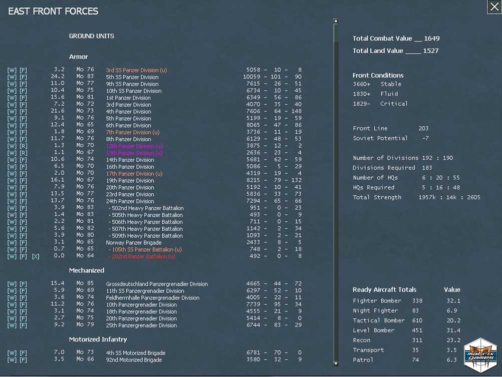 - East Front Screen provides info on German forces, front line and Soviet offensive potential