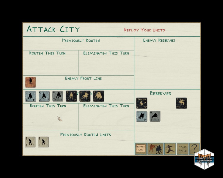Build your army from an array of different units and historical leaders each with their own attributes to storm across the Italian peninsula. When meeting the enemy in combat, engage in a simple but tactical siege/battle system. Each side has a deck of option cards that simulate a variety of military and political events such as reinforcements, political influence, revolts, desertion, and battle tactics for Hannibal and Scipio Africanus.