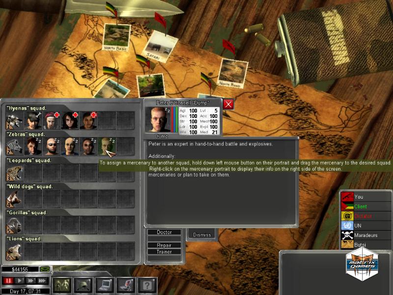 Hire over 30 mercenaries to fill out multiple squads with various specialties and skills and unique personalities, some work together better than others - you'll need not only mercenaries with good weapon skills, but also medics, mechanics, scouts and leaders.