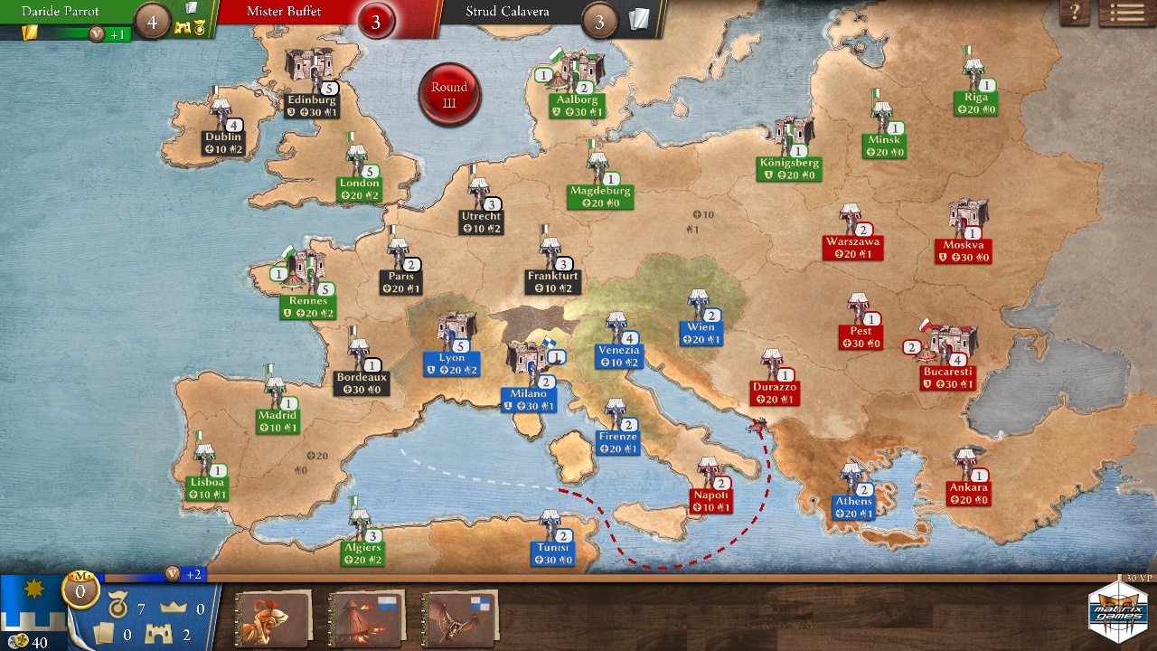 Magnifico is a popular region-based board game where the ultimate goal is to dominate 16th century Europe. Now you can play it on PC! Players are faced with tough economic and military decisions as they earn Victory Points and attempt to outbid opponents at the auction and get their hands on Leonardo Da Vincis most powerful war machines.