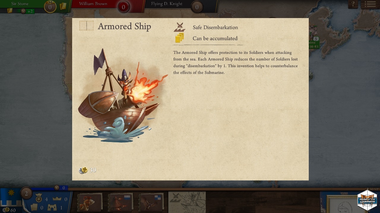 Bid at the auction for Da Vinci’s inventions. Upgrade your infantry, tanks and aircraft with new technologies to increase reliability and combat power. Earn Victory points for most castles, territories, technologies, being Magnifico and other special actions. Fight battles with wondrous technologies but be careful as tanks can explode!