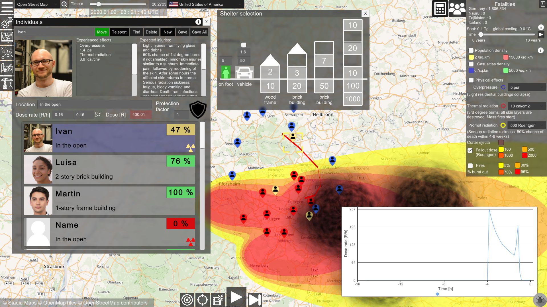 You can place yourself, your family and friends into the simulation to estimate the expected injuries and survival probability. The amount of burnt fuel and produced soot are also calculated to estimate the effects of nuclear winter using a simplified model.