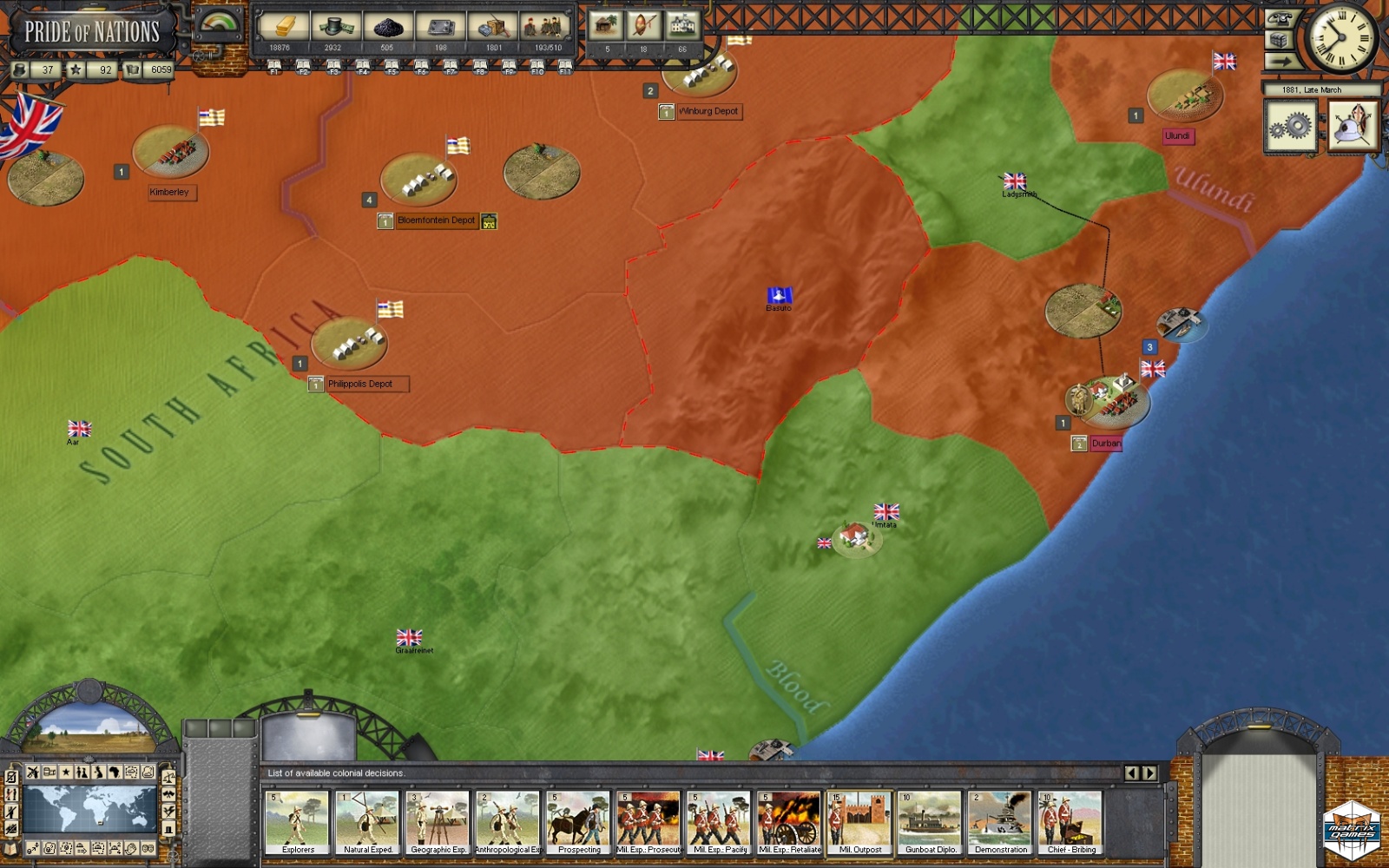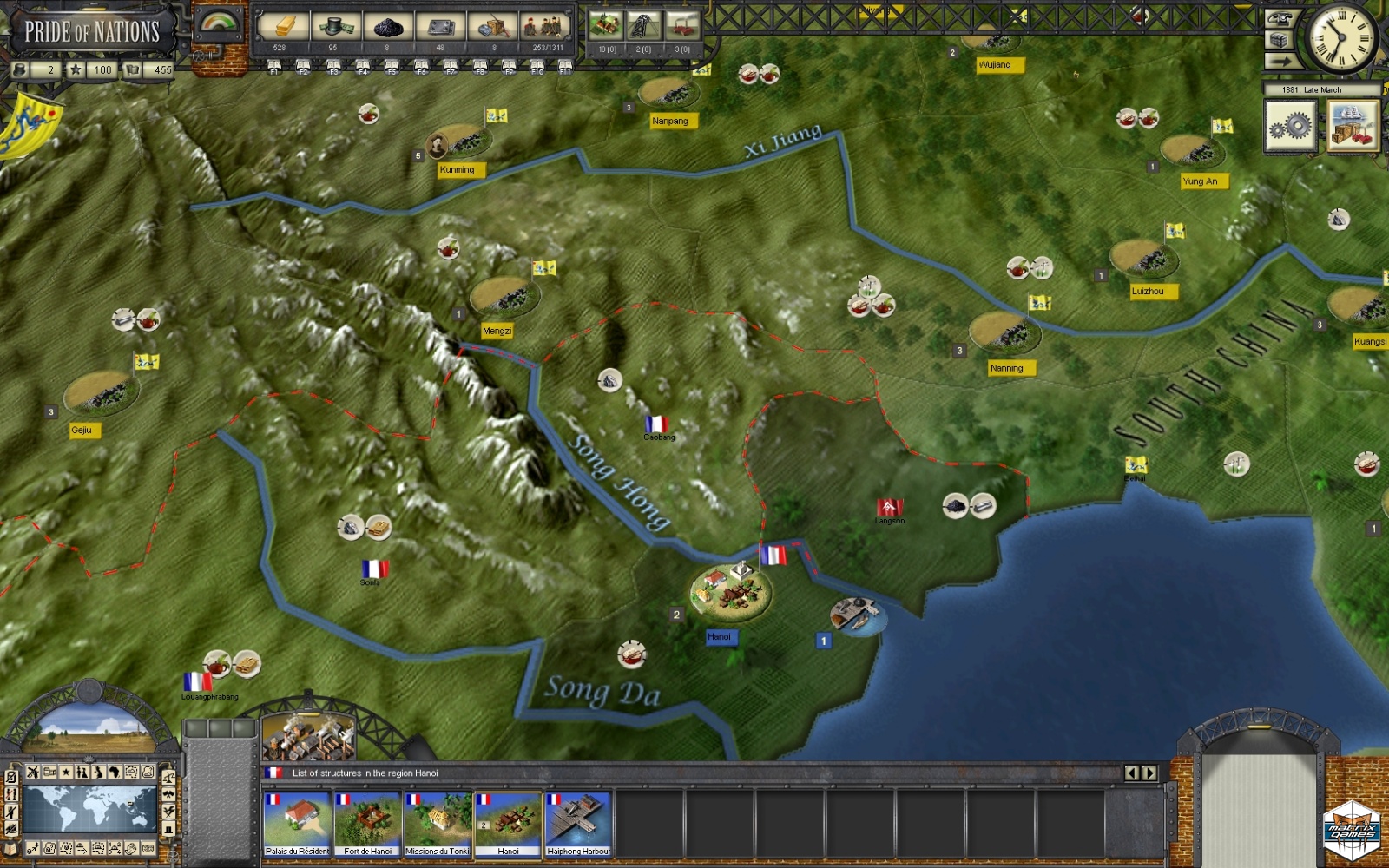 This medium campaign scenario starts in 1880 with most major powers having a solid industrial base and solved domestic issues (Civil War in the USA, Meiji reforms in Japan) or international recognition (Germany and Italy have succeeded in their unification process).