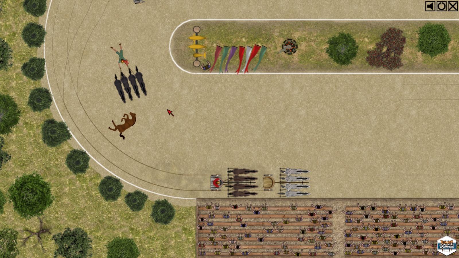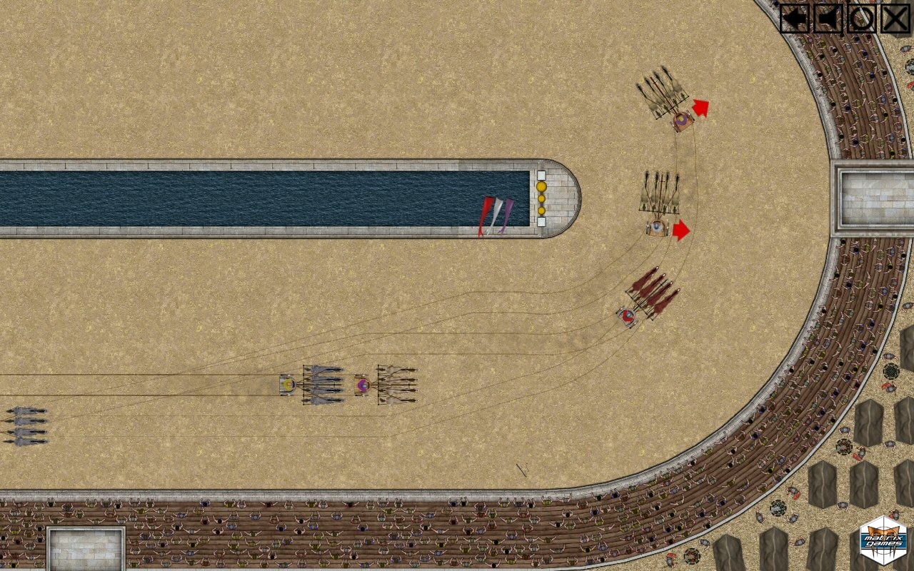 If you have come here it is because you wish to manage your own chariot racing team. Train your drivers and give them the finest equipment and horses. If you do this well, your chariots will provide you with both wealth and fame. but beware! Chariot races are dangerous. Accidents may occur and rival teams might try to harm your charioteers during the race. Make sure you do not grow too attached to your charioteers and always have a replacement available. Good luck!