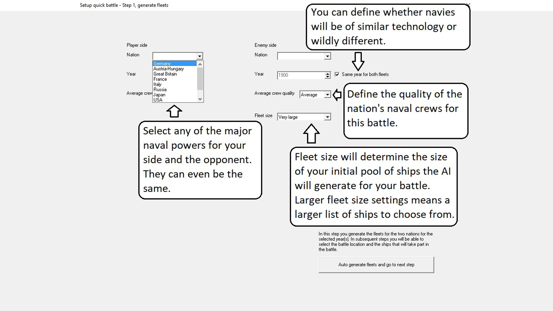 • Varied Technology and Year Parameters: Set the fleets to be of a similar technological level for a balanced skirmish or create hypothetical scenarios with wide gaps in naval technology.