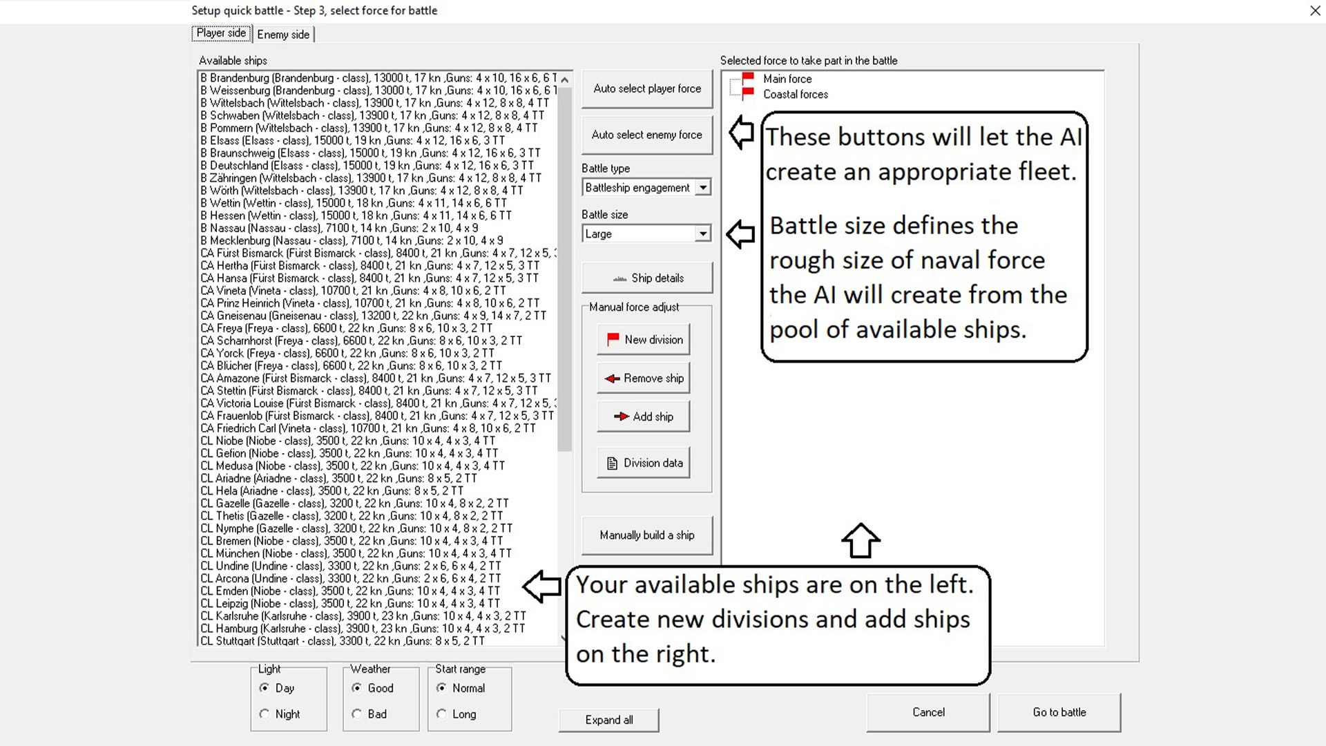 For those who prefer a short fight to a long campaign or just want to get right to the battle, the new Quick Battles system allows you to generate new battles from across the Rule the Waves 3 timeline, ranging from small skirmishes to full fleet battles and matching up balanced or unbalanced forces from very different periods.