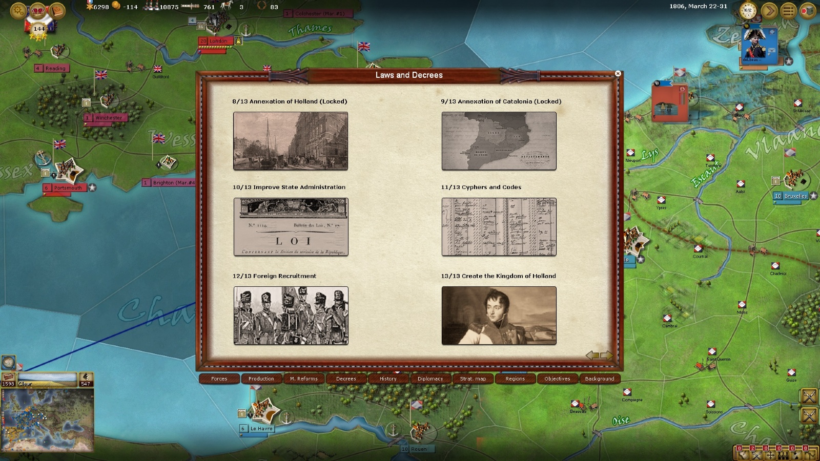 New interface to promote your generals or see the hierarchy of your army more easily.You can guide your allies, if they are AI nations, so you get the most out of them. New history screen where you can check the evolution of your army and the army of your enemies. Form or disband divisions and appoint generals to lead them. Promote generals but beware of the political support of some, if they are bypassed in favour of young promising officers. Lead expeditionary forces assisted by allies and minor nations. Use special orders like forced march, build redoubts, disband units. Muster partisans and levy special emergency troops.