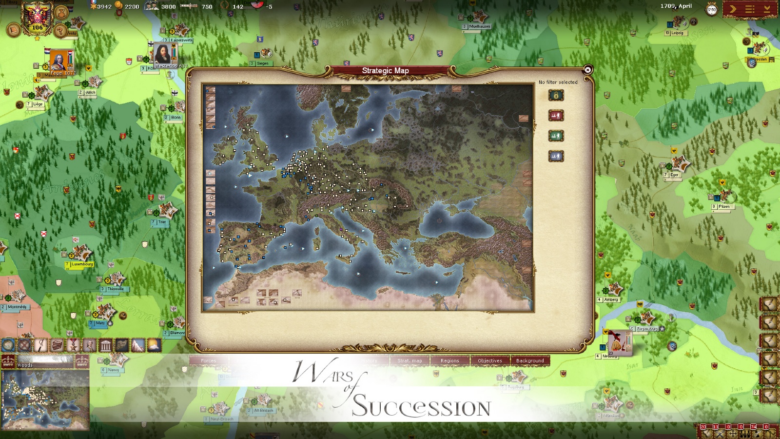 The game covers all of Europe, from the Western seaboard to the Volga. The two different big wars focus each on one side of the continent (Spanish Succession over Western and southwest Europe, Great Northern War in Eastern and Northeastern Europe). Time span is from 1700 to 1720. The scenarios are 5 in total, with 1 introductory (Italy 1701) tutorial and 2 main grand scenarios of Spanish Succession War and Great Northern War, plus 2 minor Western Europe campaigns scenarios (respectively 1706 and 1709). Game map is divided into more than 5,000 regions, with a variety of terrain, climates and development level.