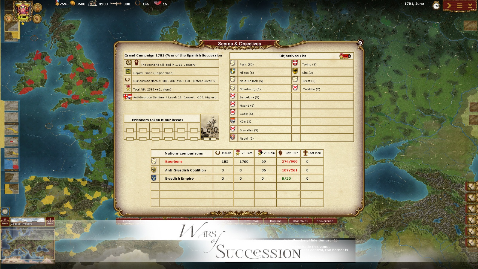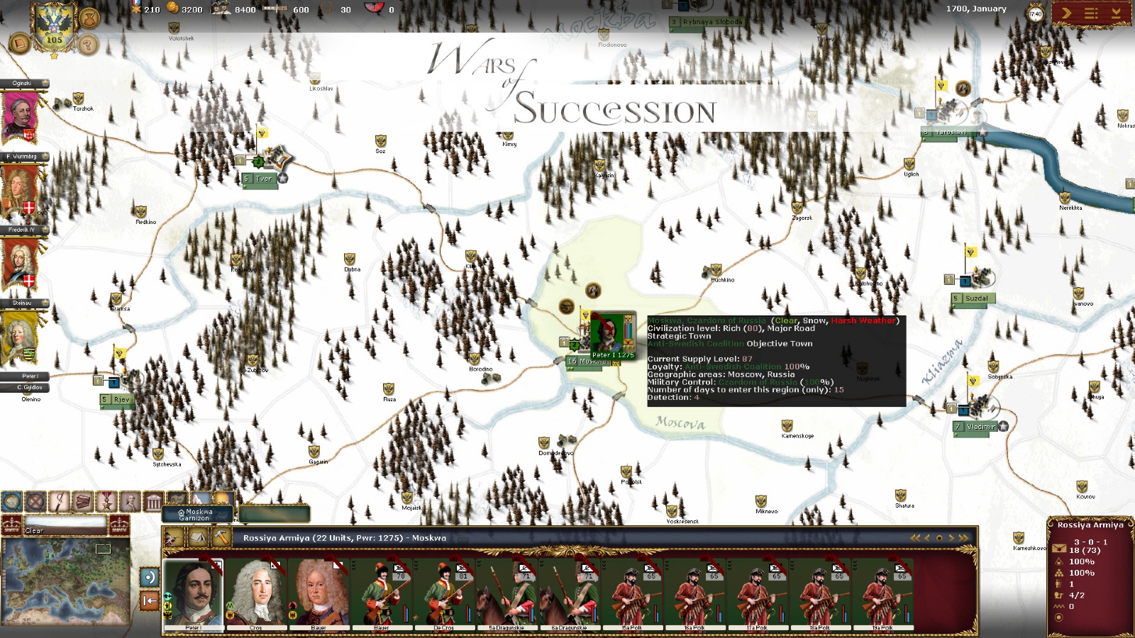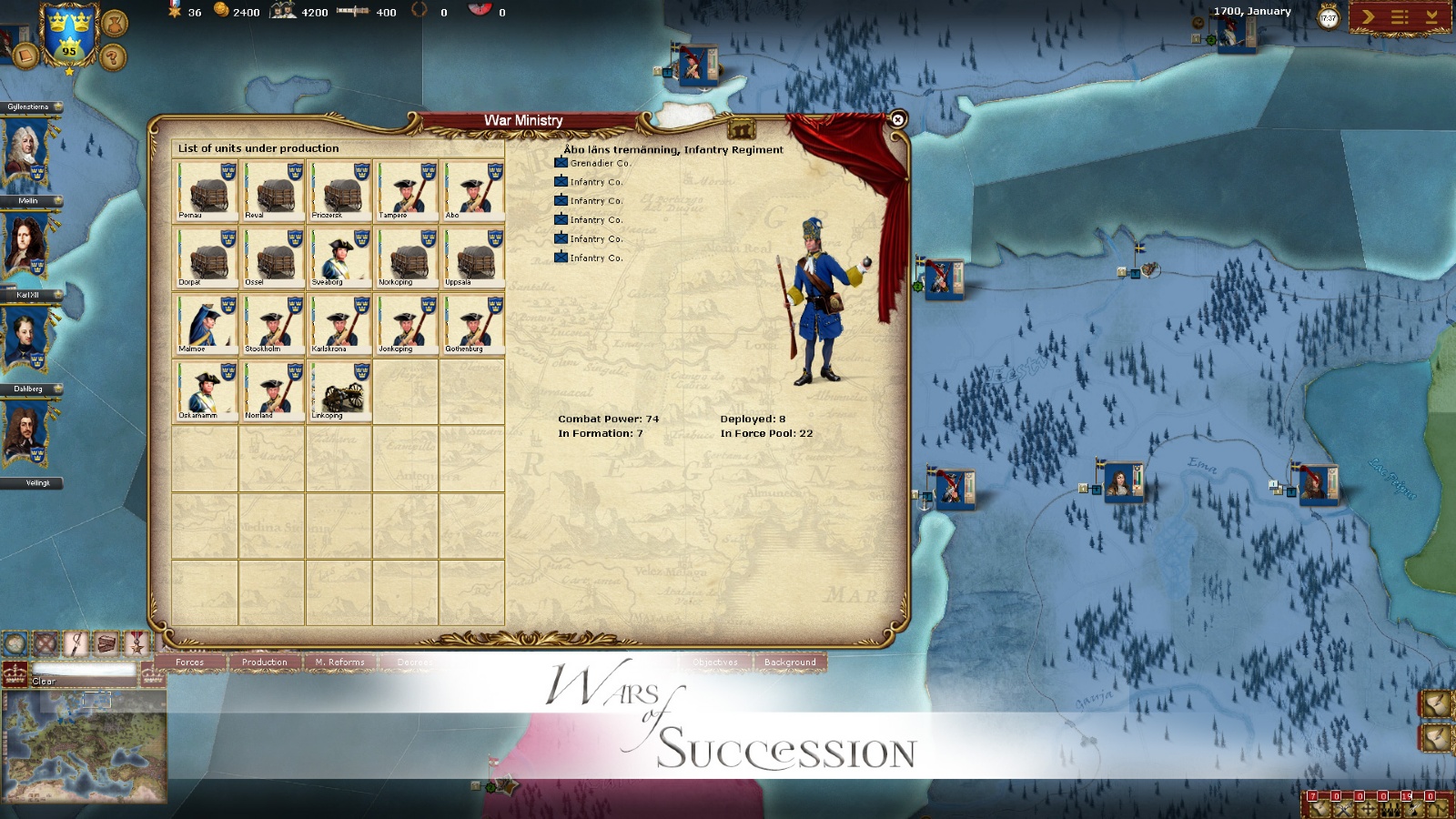 Ageod’s Wars of Succession is a strategic game designed to cover two major wars that consumed Europe at the eve of the 18th Century. One was the War of Spanish Succession (1701-1713), pitting the French & Spanish Bourbons monarchs against the Grand Alliance built by Austrian Habsburg, Britain and the United Provinces. The other is the Great Northern War (1700-1721), between Sweden and Russia (and her allies), most of which focused around the succession of Poland. The two wars are played in separate scenarios.